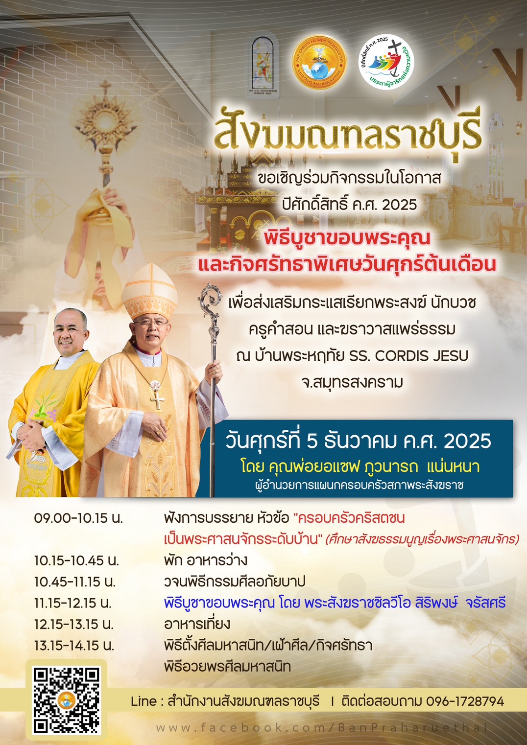 ขอเชิญร่วมกิจกรรมในโอกาสปีศักดิ์สิทธิ์ ค.ศ. 2025 อวยพรศีลมหาสนิท และกิจศรัทธาพิเศษวันศุกร์ต้นเดือนเพื่อส่งเสริมกระแสเรียกพระสงฆ์ นักบวช ครูคำสอน และฆราวาสแพร่ธรรม วันศุกร์ที่ 7 พฤศจิกายน ค.ศ. 2025 เวลา 09.00 -14.15 น.โดย  คุณพ่อยอแซฟ ไพศาล ยอแซฟ ผู้อำนวยการแผนกพิธีกรรมสังฆมณฑลราชบุรี หัวข้อ "พิธีกรรมตามแนวทางสังคายนาวาติกันที่ 2" (ศึกษาสังฆธรรมนูญเรื่องพิธีกรรมศักดิ์สิทธิ์) ณ บ้านพระหฤทัย SS.CORDIS JESU จ.สมุทรสงคราม